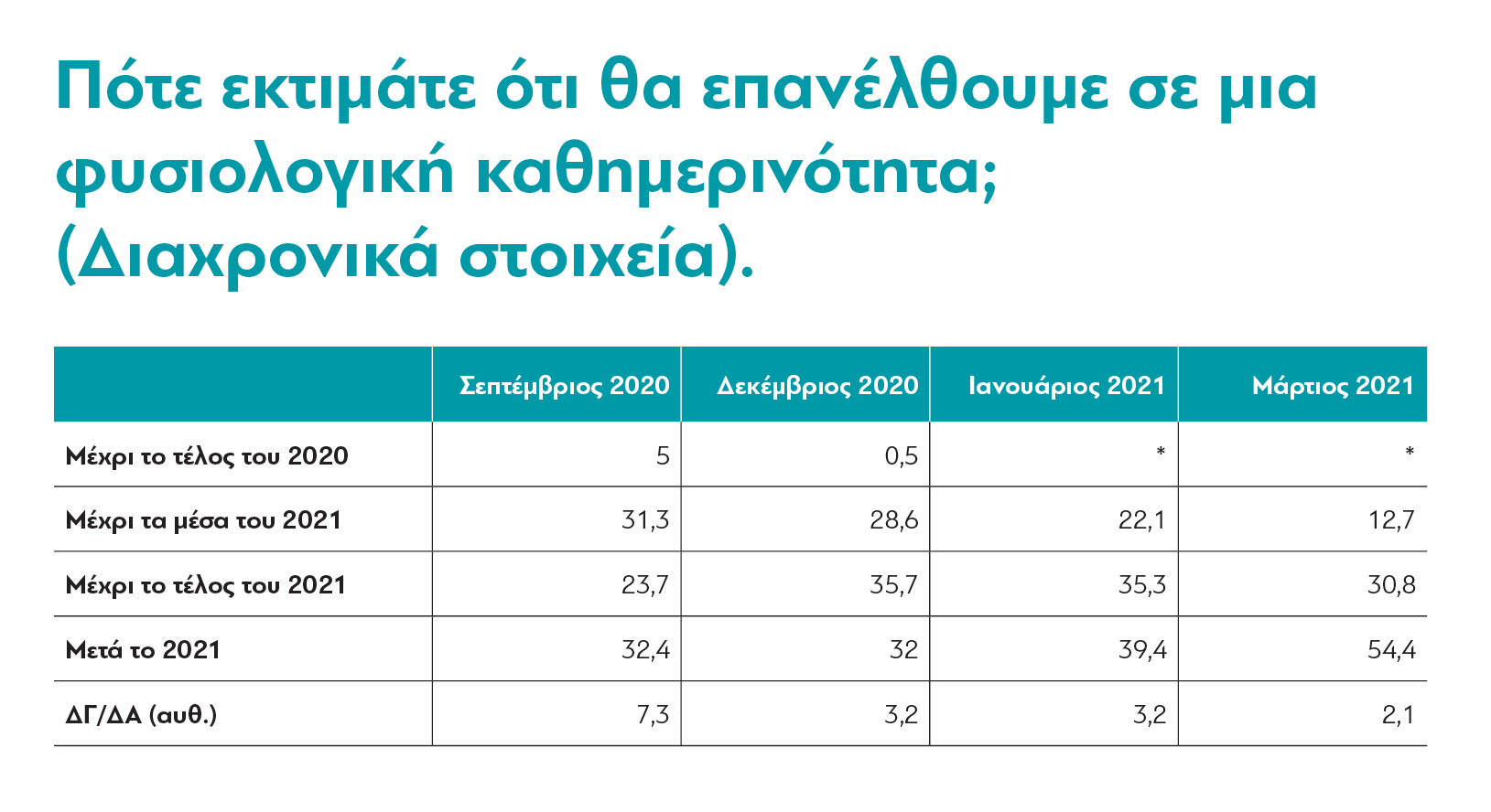 Μαζί με την υποχώρηση της αισιοδοξίας εδραιώνεται και ο ρεαλισμός. Οι προσδοκίες των Ελλήνων, πια, είναι εντελώς διαφορετικές από ό,τι ένα χρόνο πριν, όταν οι περισσότεροι θεωρούσαν ότι αντιμετωπίζουμε ένα φαινόμενο που θα διαρκέσει μόνο λίγους μήνες. Πλέον η πλειοψηφία των Ελλήνων (54,4%) θεωρούν ότι η κανονικότητα θα επανέλθει από κάποια στιγμή μετά το 2021.