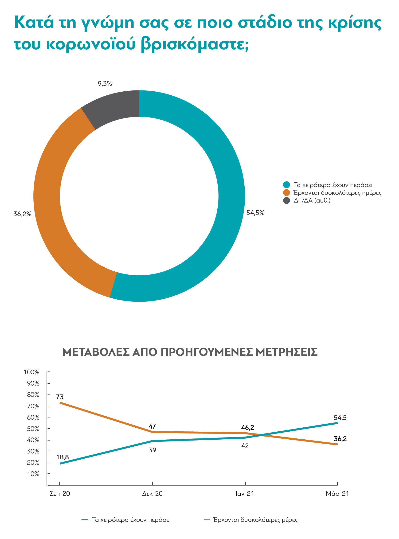 Παρ’ όλα αυτά, πλέον για πρώτη φορά οι περισσότεροι Έλληνες θεωρούν ότι “τα χειρότερα έχουν περάσει”. Στην ερώτηση για το στάδιο της κρίσης στο οποίο, κατά τη γνώμη τους βρισκόμαστε, από τον Σεπτέμβριο του 2020 και μέχρι τον περασμένο Ιανουάριο, οι περισσότεροι απαντούσαν ότι “τα χειρότερα είναι μπροστά μας”. Η επιτυχημένη έναρξη των εμβολιασμών φαίνεται πως άλλαξε αυτή την εικόνα. Πλέον μια (όχι πολύ μεγάλη, αλλά σαφής) πλειοψηφία, το 54,5%, λένε ότι τα χειρότερα είναι πίσω μας.