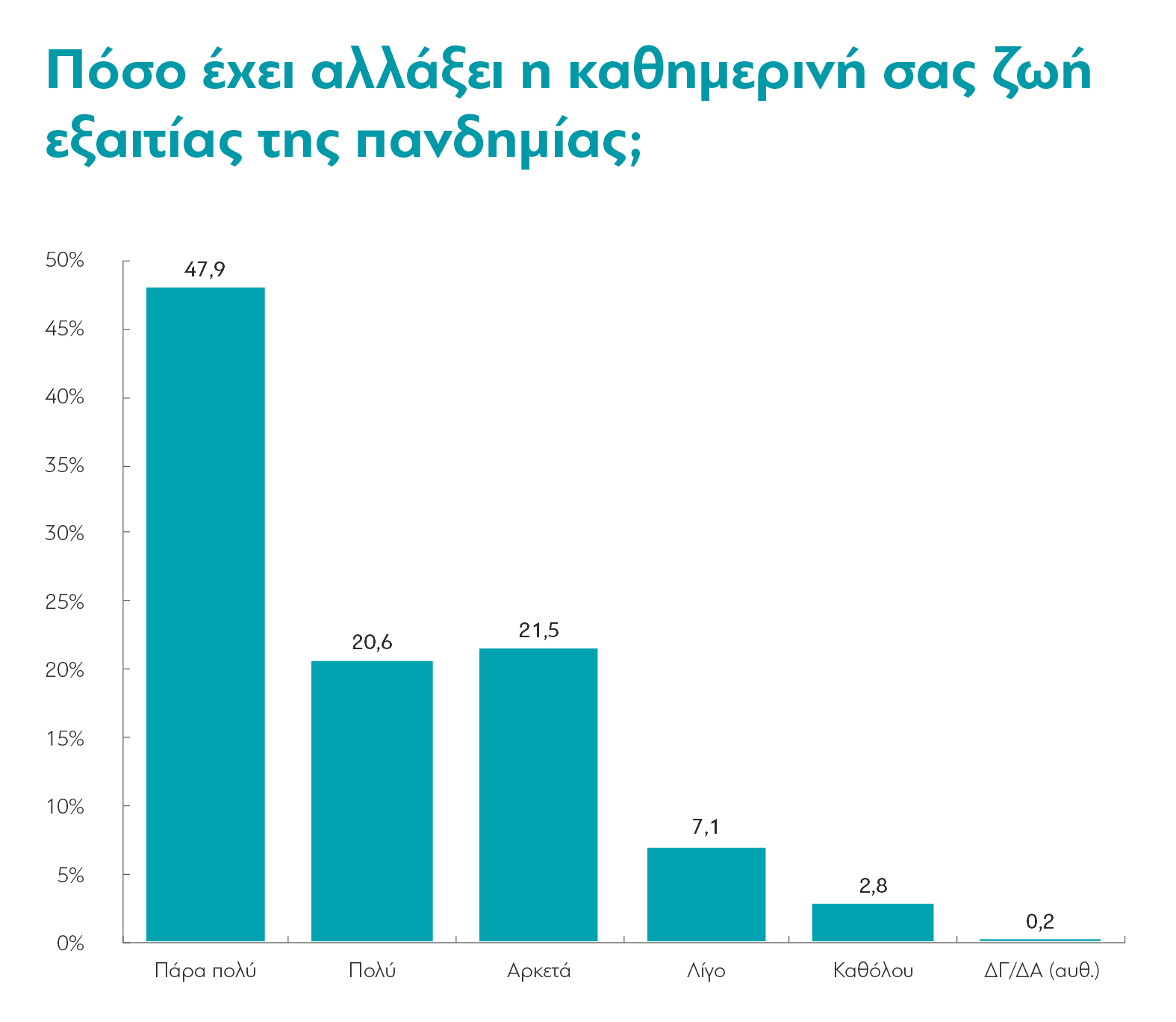 Όσον αφορά την καθημερινότητα, καθώς από το Νοέμβριο και μετά η χώρα είναι σε μια σχετικά συνεχή “καραντίνα”, οι ζωές των πολιτών έχουν “παγώσει”. 7 στους 10 λένε ότι οι ζωές τους έχουν αλλάξει “πολύ” ή “πάρα πολύ” -στους νέους ηλικίας 17-24 είναι σχεδόν 9 στους 10.