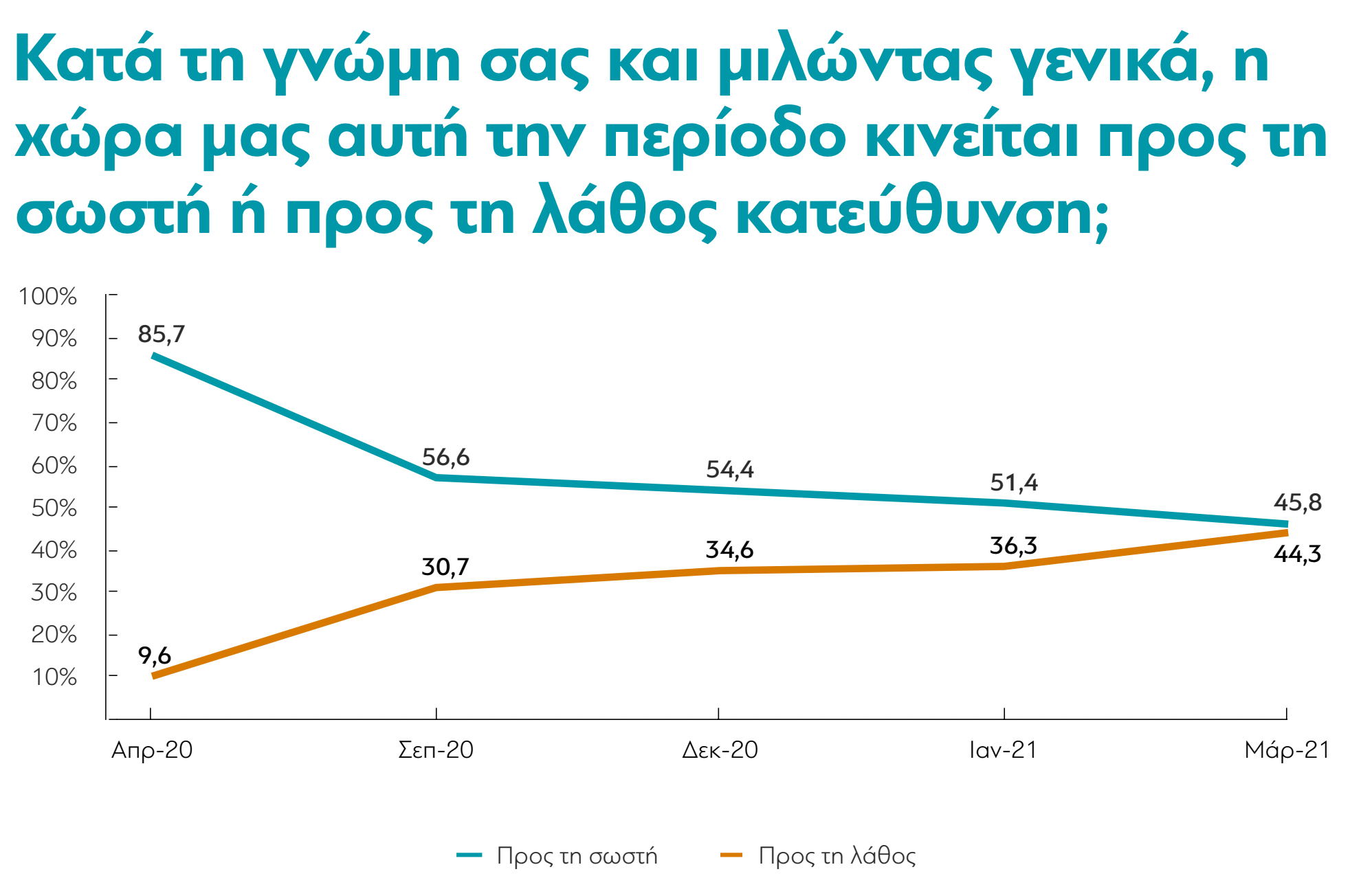Πλέον, φυσικά, τα πράγματα είναι πολύ διαφορετικά. Το ποσοστό όσων πιστεύουν ότι πάμε προς τη σωστή κατεύθυνση είναι πια το 46%. Έχει ενδιαφέρον το ότι η ομάδα του πληθυσμού που θεωρεί περισσότερο ότι πάμε προς τη σωστή κατεύθυνση είναι οι ηλικίας άνω των 65, που συμφωνούν σε ποσοστό 59,2%. Αντίθετα, οι νέοι ηλικίας 17-24 πιστεύουν το αντίστροφο.