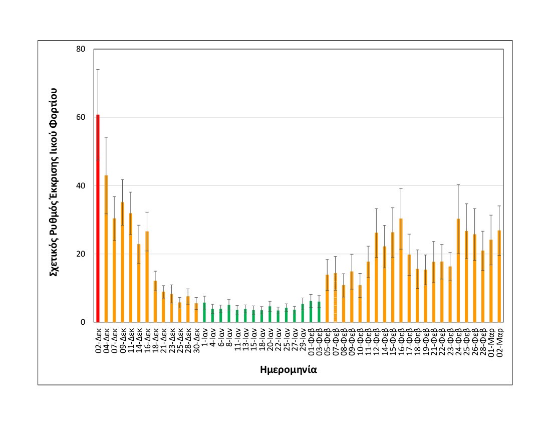 Συγκεκριμένα, η μέση τιμή των δύο πιο πρόσφατων μετρήσεων, δηλαδή της Δευτέρας 01/03 και της Τρίτης 02/03, είναι αυξημένη κατά 10% σε σχέση τη μέση τιμή των δύο αμέσως προηγούμενων μετρήσεων, δηλαδή της Παρασκευής 26/2 και της Κυριακής 28/2 . Συγκρίνοντας τις μετρήσεις αυτής της Δευτέρας και Τρίτης σε σχέση με τις αντίστοιχες της Δευτέρας 22/2 και Τρίτης 23/2, η μέση τιμή είναι αυξημένη κατά 50%, δίνοντας μια πιο ξεκάθαρη εικόνα της σταδιακής ανοδικής πορείας.