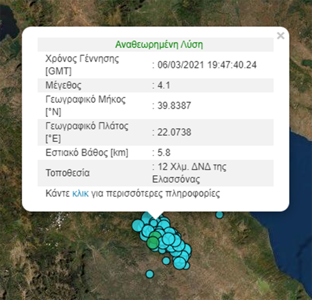 Ασθενής σεισμική δόνηση με μέγεθος 4,1 στην κλίμακα Ρίχτερ σημειώθηκε στις 21:47 στην περιοχή της Ελασσόνας. Εκ μέρους των φορέων συγκρότησης του Ενιαίου Εθνικού Σεισμολογικού Δικτύου, το Γεωδυναμικό Ινστιτούτο του Εθνικού Αστεροσκοπείου Αθηνών ανακοινώνει ότι το σεισμολογικό δίκτυο κατέγραψε τον σεισμό σε απόσταση 252 χλμ. ΒΔ της Αθήνας με το επίκεντρο της δόνησης να εντοπίζεται 12 χλμ. ΔΝΔ της Ελασσόνας.
