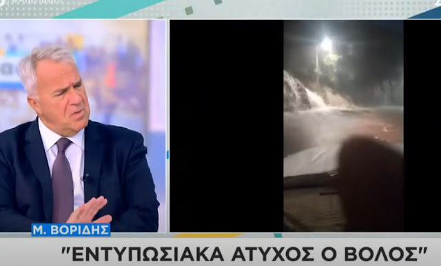 «Eίναι εντυπωσιακά άτυχος ο Βόλος , από την έννοια ότι πάλι είχαμε πολύ εκτεταμένο καιρικό φαινόμενο. Οι πρώτες μετρήσεις, παρόλο που δεν υπάρχει επίσημη καταγραφή, κάνουν λόγο για νερό μεγαλύτερο από τον Ιανό και μικρότερο από τον… Daniel. Ήταν απόλυτα εστιασμένο στον Βόλο» ανέφερε ο υπουργός Επικρατείας, Μάκης Βορίδης, εν μέσω της νέας καταστροφικής πλημμύρας στη Θεσσαλία.