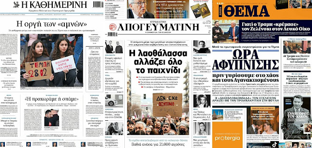 Στα άλλα πρωτοσέλιδα της Κυριακής διαβάζουμε «Η μέρα που άλλαξε τη χώρα» (Βήμα), «Ρέκβιεμ Μητσοτάκη!» (Δημοκρατία), «Το παζλ των ευθυνών για τα Τέμπη» (Real), «Απόδραση με εκλογές σχεδιάζει ο Μητσοτάκης» (Κόντρα), «Είναι πλέον βάρος – κυβέρνηση χωρίς οξυγόνο» (Αυγή), «Η Δημοκρατία μας χρειάζεται επειγόντως επανίδρυση» (Εστία).