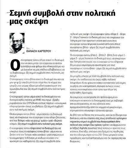 Ο συνταξιούχος δημοσιογράφος και στενός φίλος του Αλ. Τσίπρα, ασκεί σφοδρή κριτική (χωρίς να τους κατονομάζει, αλλά τους φωτογραφίζει ευκρινώς) σε Φίλη, Κούλογλου και Μπίστη γιατί αφενός διαφωνούν με τη “λογική” Πολάκη και αφετέρου για τον πολακισμό που προσπαθεί να επιβάλλει ως “μοντέλο πολιτικής” ο Τσίπρας. Επίσης, ο Καρτερός διαφωνεί και τα χώνει αγρίως στους συντρόφους του γιατί έχουν διαφορετική άποψη. Μα κι αυτοί οι “διαφωνούντες” δεν διαβάζουν Καρτερό που κάθε μέρα δίνει γραμμή…