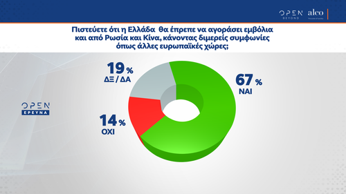 Σύμφωνα με την έρευνα οι πολίτες πιστεύουν ότι η χώρα μας θα έπρεπε να αγοράσει εμβόλια από τη Ρωσία και την Κίνα, κάνοντας διμερείς συμφωνίες όπως άλλες ευρωπαϊκές χώρες. Ειδικότερα σε αυτή την ερώτηση το 67% απάντησε «ναι», το 14% «όχι», ενώ ότι δεν γνωρίζει απάντησε το 19%.