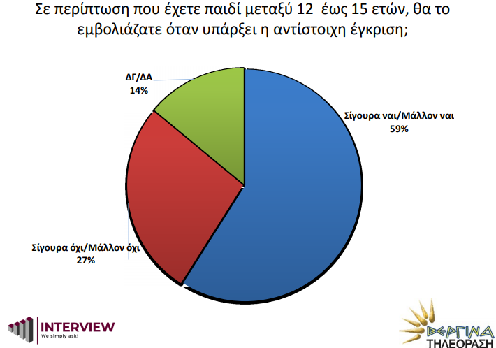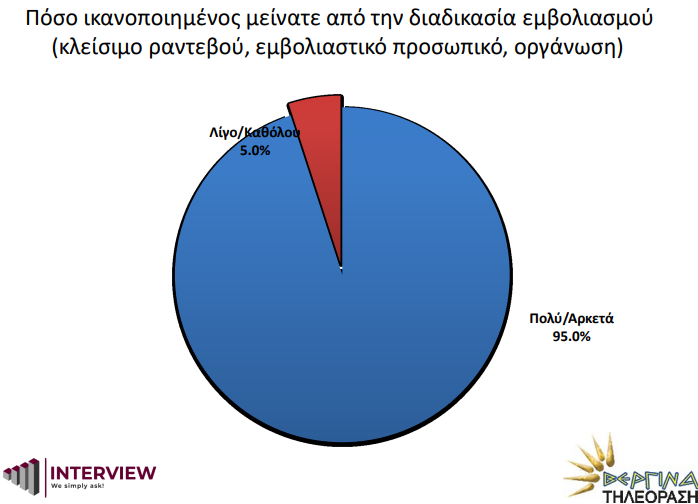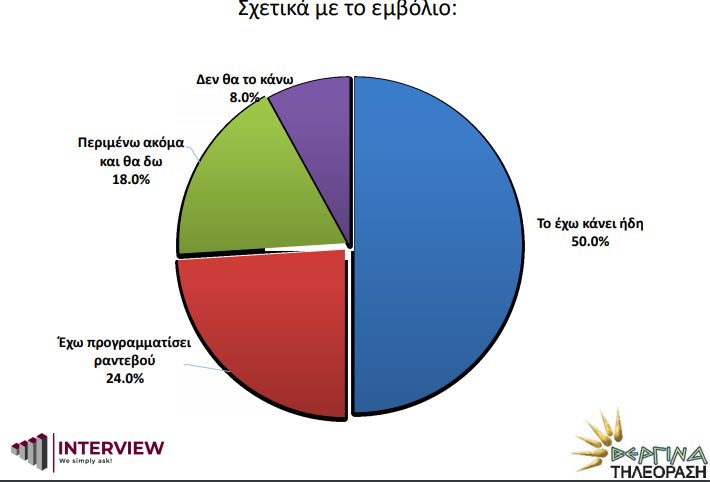 Σύμφωνα με τη δημοσκόπηση 50% των ερωτηθέντων δηλώνει ότι έχει ήδη εμβολιαστεί κι ένα 24% έχει προγραμματισμένο ραντεβού ενώ μόνο το 26% φαίνεται ότι δε θα εμβολιαστεί ή εμφανίζεται επιφυλακτικό. Οι πολίτες σε εντυπωσιακό βαθμό (95%) δείχνουν μεγάλη ικανοποίηση από τη διαδικασία εμβολιασμού (ραντεβού, προσωπικό, οργάνωση) ενώ για πρώτη φορά καταμετρείται το ποσοστό των ανεπιθύμητων ενεργειών όσων εμβολιάστηκαν. Έτσι, 70%δεν εμφάνισε καθόλου παρενέργειες. Επίσης 59% των ερωτηθέντων λέει ναι στον εμβολιασμό παιδιών 12 έως 15 χρόνων.