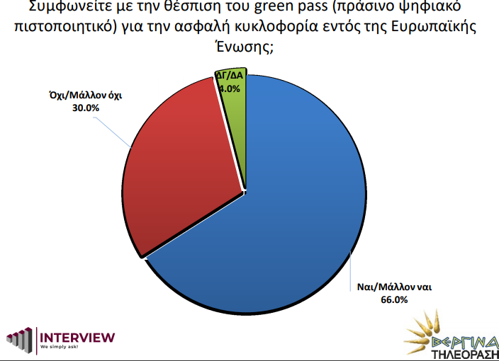 Υπέρ της θέσπισης του πράσινου ψηφιακού πιστοποιητικού (Green Pass) εμφανίζεται το 66% των ερωτηθέντων καθώς και της άρσης της πατέντας των εμβολίων (58%) ενώ 60% πιστεύει πως η χώρα μας έχει ευνοηθεί πολύ από την ένταξή της στην ΕΕ πριν σαράντα χρόνια (1981).