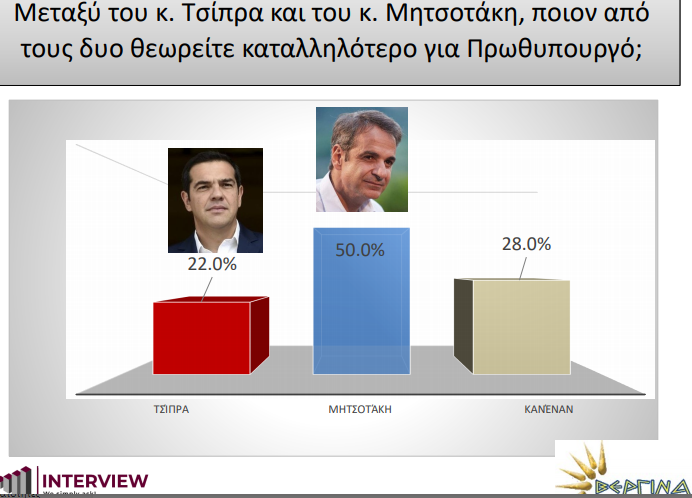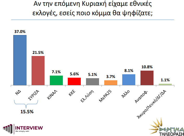 Παραμένει πρώτη και με τεράστια διαφορά η ΝΔ με ποσοστό 37%, έναντι του ΣΥΡΙΖΑ που ακολουθεί με 21,5% έχοντας διαφορά 15,5 μονάδων. Στη νέα δημοσκόπηση της Interview για λογαριασμό της Βεργίνας Τηλεόραση ο Κυριάκος Μητσοτάκης εμφανίζεται ως ο καταλληλότερος για πρωθυπουργός (50%) με κυριότερο αντίπαλο τον «Κανένα» (28%) και με τον αρχηγό της αξιωματικής αντιπολίτευσης Αλέξη Τσίπρα να ακολουθεί (22%).