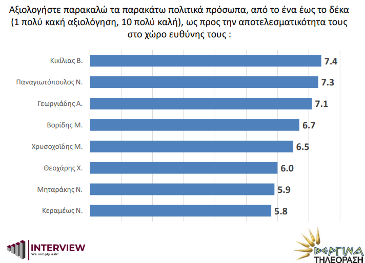 Πρώτοι σε αποτελεσματικότητα σύμφωνα με την αξιολόγηση των πολιτών είναι οι: Βασίλης Κικίλιας (7.4), Νίκος Παναγιωτόπουλος (7.3), και Άδωνις Γεωργιάδης (7.1) κι ακολουθούν ο Μάκης Βορίδης (6.7), ο Μιχάλης Χρυσοχοΐδης (6.5), ο Χάρης Θεοχάρης (6.0), ο Νότης Μηταράκης (5.9) και τελευταία η Νίκη Κεραμέως (5.8).