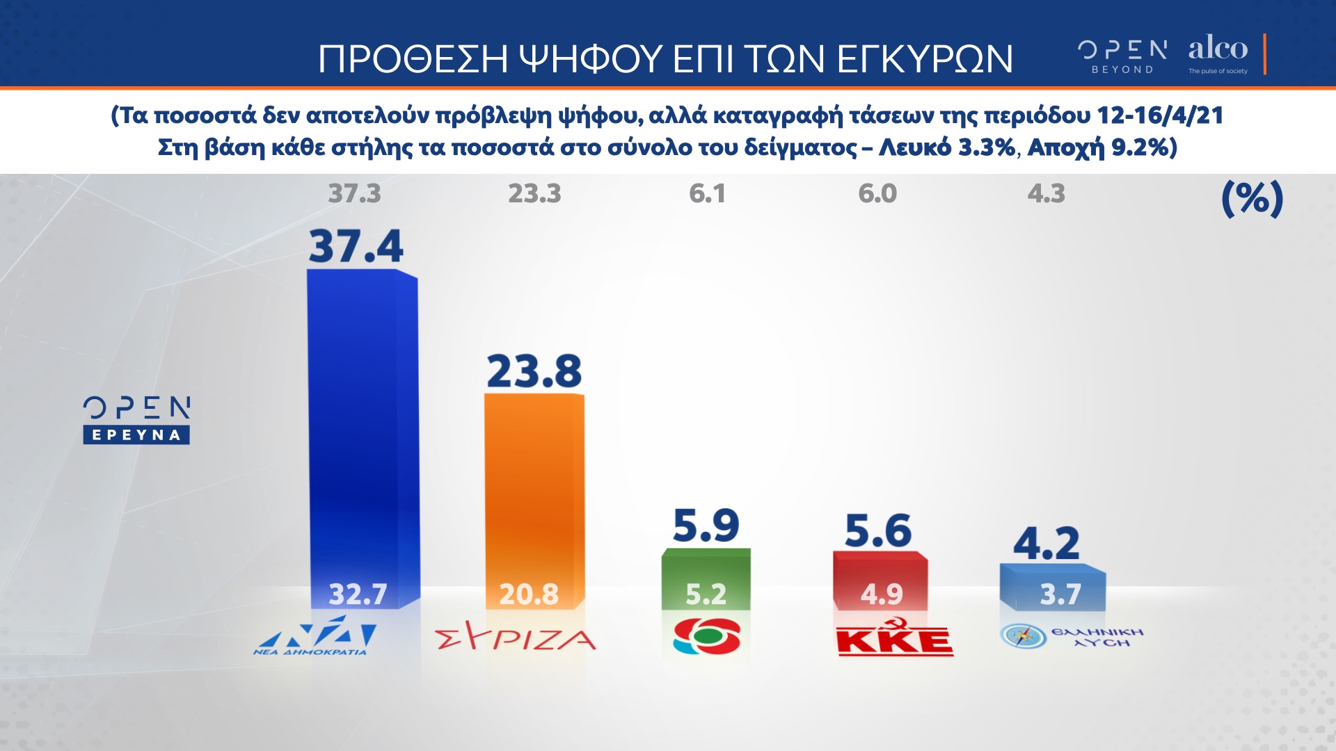 Στη δημοσκόπηση της Alco για το OPEN η διαφορά της Νέας Δημοκρατίας από τον ΣΥΡΙΖΑ φτάνει το 13,6%. Συγκεκριμένα η Νέα Δημοκρατία συγκεντρώνει ποσοστό 37,4%, με τον ΣΥΡΙΖΑ να ακολουθεί στο 23,8. 5,9% για το ΚΙΝΑΛ, 5,6% για το ΚΚΕ, στο 4,2 η Ελληνική Λύση, στο 2,9% το ΜέΡΑ 25. Το ποσοστό των αναποφάσιστων φτάνει στο 13,7%. Στο ερώτημα για το ποιον εμπιστεύεστε περισσότερο ως πρωθυπουργό, ο Κυριάκος Μητσοτάκης συγκεντρώνει 43%, ο «κανένας» 29%, ο Αλέξης Τσίπρας 23%.