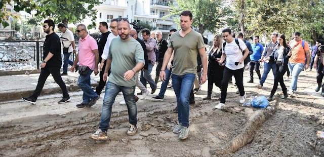 Ο Στέφανος Κασσελάκης επισκέφθηκε πλημμυροπαθείς και άκουσε τις καταγγελίες τους για τη διαχείριση της καταστροφής από τη δημοτική αρχή και την κυβέρνηση.
