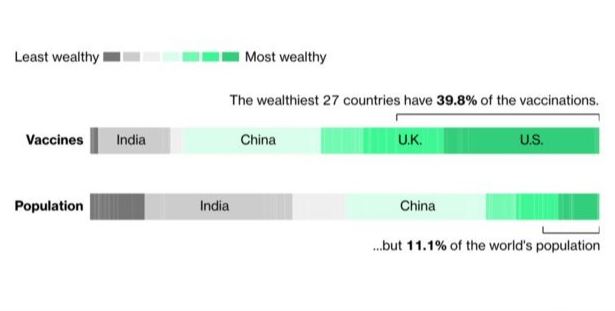 Οπως μεταδίδει το Bloomberg, το 40% των εμβολίων Covid-19 που χορηγήθηκαν παγκοσμίως έχουν γίνει σε άτομα 27 πλούσιων χωρών που αντιπροσωπεύουν το 11% του παγκόσμιου πληθυσμού.