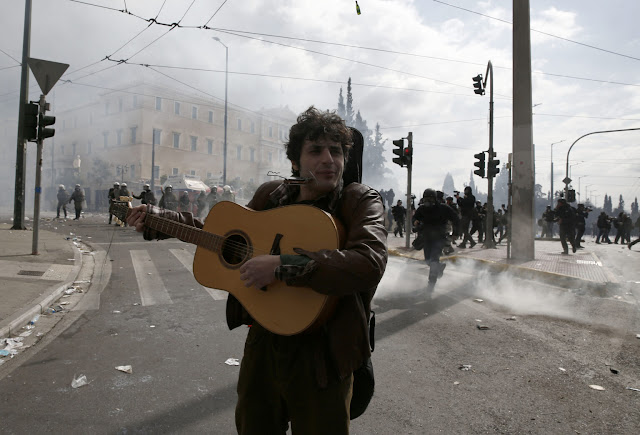 Μόνο ένας μουσικός έμεινε στο σημείο, αψήφησε τα χημικά και τους καπνούς και συνέχισε να παίζει με την κιθάρα του…