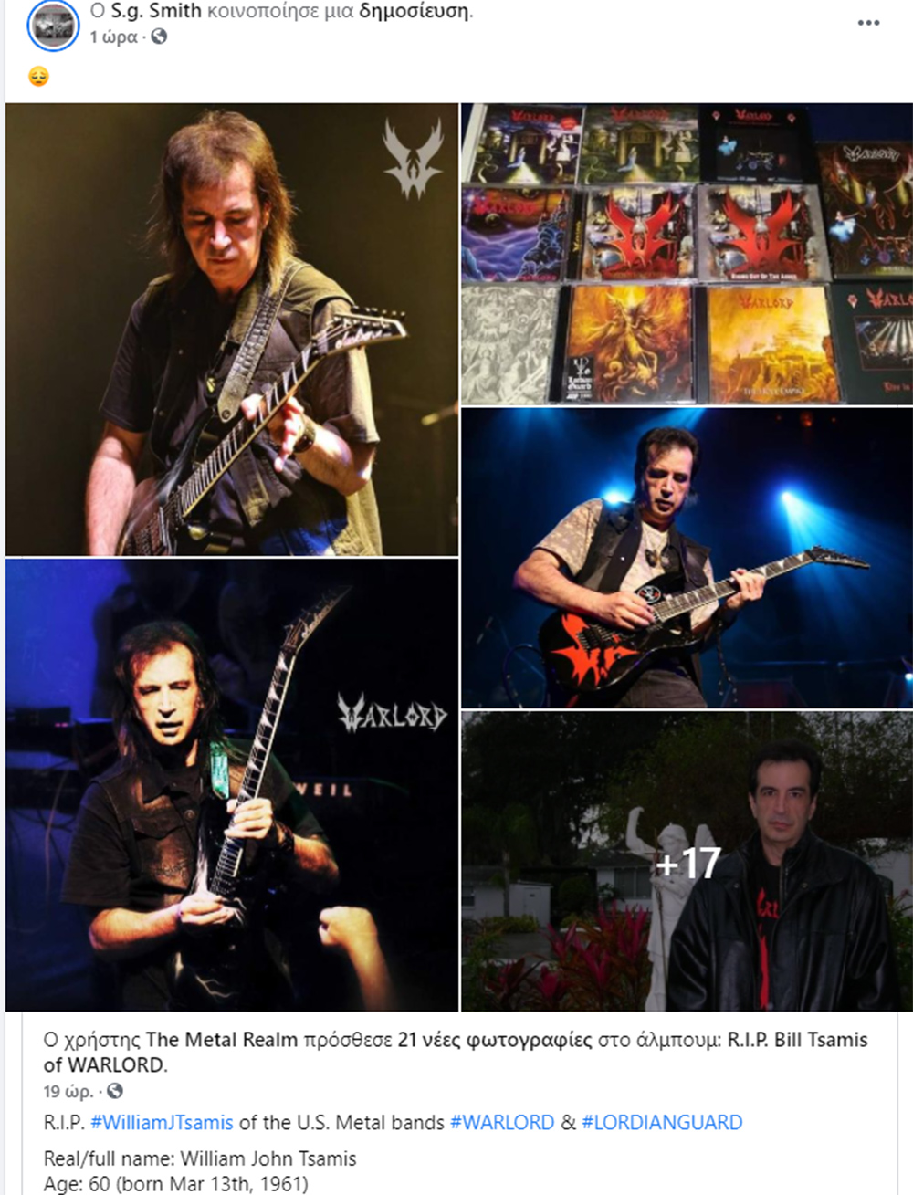 Έφυγε από την ζωή σε ηλικία 60 ετών ο Bill Tsamis, κιθαρίστας και βασικός συνθέτης των Warlord. Η δυσάρεστη είδηση έγινε γνωστή μέσω ανάρτησης στην ομάδα Warlord Fan Club στο Facebook, όπου ως ημερομηνία θανάτου αναφέρεται η 13η Μαΐου.