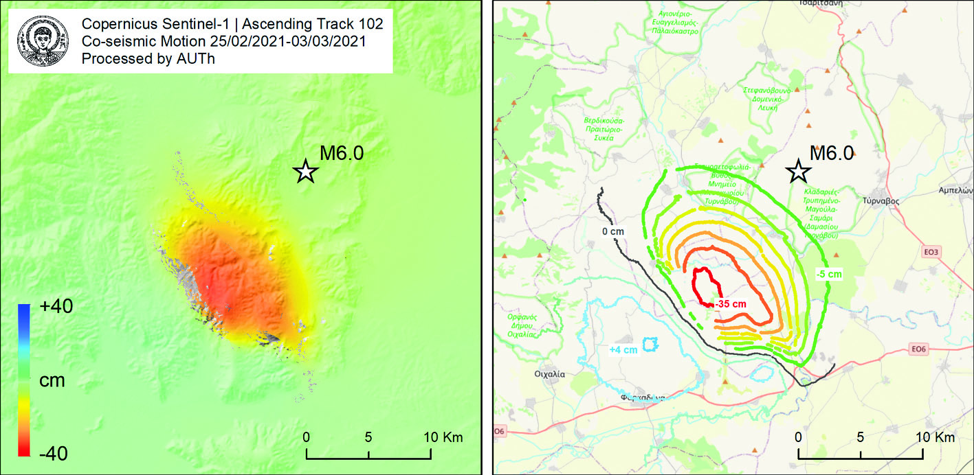 Στο μεταξύ, ο σεισμός του Τυρνάβου βρέθηκε στο επίκεντρο και της υπηρεσίας geObservatory του Κέντρου Παρατήρησης της Γης και Δορυφορικής Τηλεπισκόπησης BEYOND του Ινστιτούτου Αστρονομίας, Αστροφυσικής και Διαστημικών Εφαρμογών του Εθνικού Αστεροσκοπείου Αθηνών. Συγκεκριμένα, το Hellenic Mirror Site συνέλεξε εικόνες ραντάρ συνθετικού ανοίγματος SAR Sentinel-1A της 25ης Φεβρουαρίου 2021 και 3ης Μαρτίου 2021 (ανοδική τροχιά δορυφόρου, 102), για τη δημιουργία του συμβολογραφήματος, όπου καταγράφεται η εδαφική παραμόρφωση στην ευρύτερη περιοχή γύρω από το επίκεντρο του σεισμού.