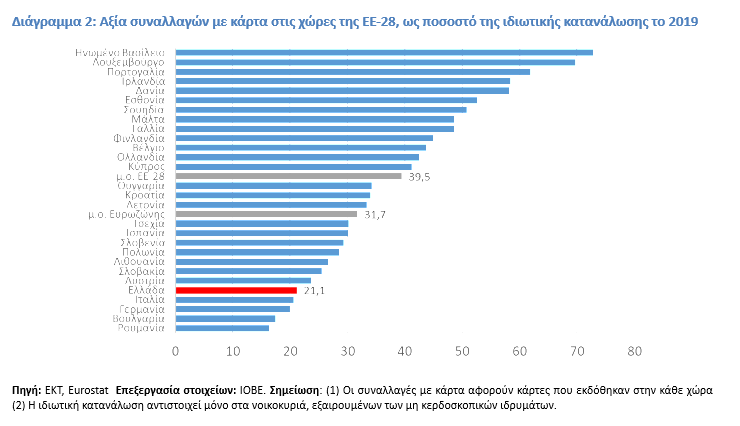 Η ισχυρή άνοδος της χρήσης καρτών στη χώρα την τελευταία πενταετία δεν κατάφερε να εξαλείψει τη διαφορά σε σχέση με το μέσο επίπεδο χρήσης καρτών της ΕΕ. Ειδικότερα, η αξία συναλλαγών με κάρτα ως ποσοστό της κατανάλωσης νοικοκυριών ανήλθε σε 21,1% στην Ελλάδα το 2019, από 7% το 2015. Παραμένει όμως σημαντικά χαμηλότερα από τον μέσο όρο της Ευρωζώνης (31,7%) και της ΕΕ-28 (39,5%).