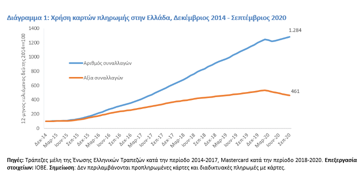Η πανδημία επηρέασε σημαντικά τη χρήση καρτών στην Ελλάδα. Με την επιβολή των πρώτων περιοριστικών μέτρων, ο αριθμός πληρωμών με κάρτα μειώθηκε (σε σύγκριση με ένα έτος πριν) κατά 7% τον Μάρτιο του 2020 και κατά 19% τον Απρίλιο, αλλά επανήλθε σε διψήφιους ρυθμούς ανόδου (13%-14%) με το άνοιγμα της οικονομίας κατά τους καλοκαιρινούς μήνες. Η αύξηση της συχνότητας στη διάρκεια της πανδημίας αφορούσε κυρίως συναλλαγές μικρότερης αξίας, ενώ η αξία των συναλλαγών με φυσική παρουσία υποχώρησε σημαντικά. Ως αποτέλεσμα, παρά τη μεγάλη άνοδο των διαδικτυακών πληρωμών με κάρτα (άνω του 20% σε αριθμό και άνω του 30% σε αξία, το δεύτερο και τρίτο τρίμηνο του 2020), η αξία συναλλαγών στο σύνολο της αγοράς κατέγραψε υψηλούς ρυθμούς συρρίκνωσης (22%-25%) ακόμα και τους καλοκαιρινούς μήνες του 2020.