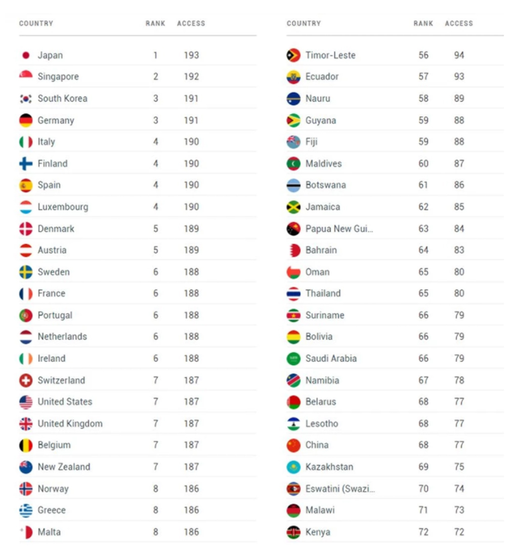 Μη λαμβάνοντας υπόψη τους ταξιδιωτικούς περιορισμούς που έχουν τεθεί σε ισχύ λόγω της πανδημίας, κατατάσσει την Ιαπωνία στην κορυφή της λίστας του, καθώς προσφέρει πρόσβαση χωρίς βίζα ή έκδοση βίζας κατά την άφιξη σε 193 προορισμούς σε όλο τον πλανήτη.