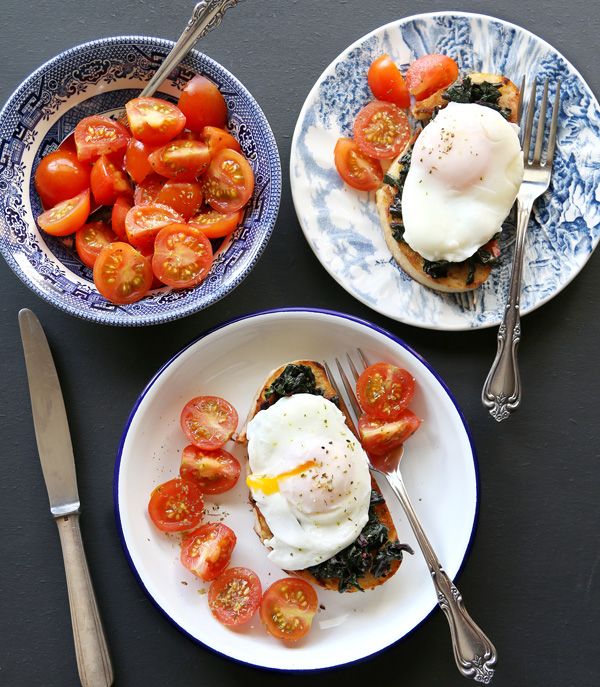 Μπρουσκέτες με σπανάκι σοτέ, αβγό ποσέ και ντοματοσαλάτα