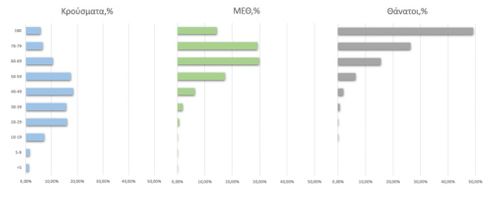 Ακολούθως παρουσιάζεται η ηλικιακή κατανομή των (α) συνολικών κρουσμάτων, (β) των περιστατικών που κατέληξαν σε θάνατο και (γ) των ασθενών που νοσηλεύονται διασωληνωμένοι: